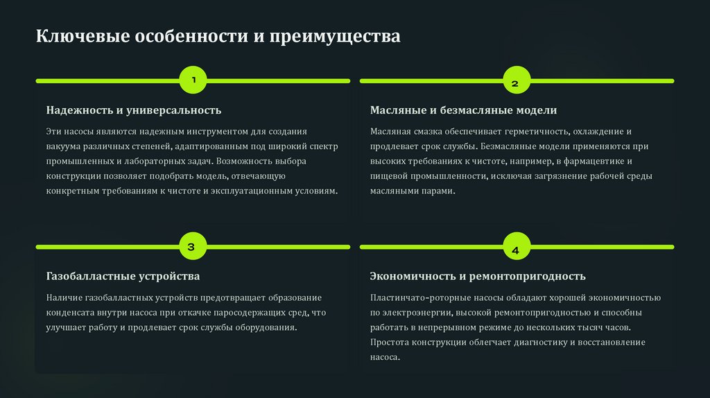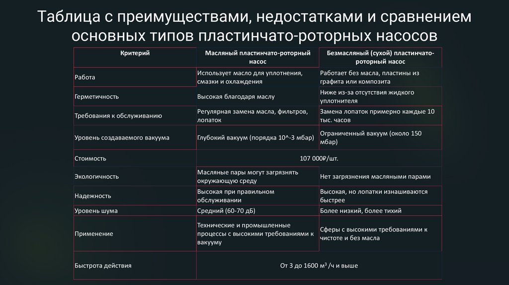 способности создавать высокие уровни вакуума. На рынке представлены как масляные, так и безмасляные варианты, выбор которых зависит