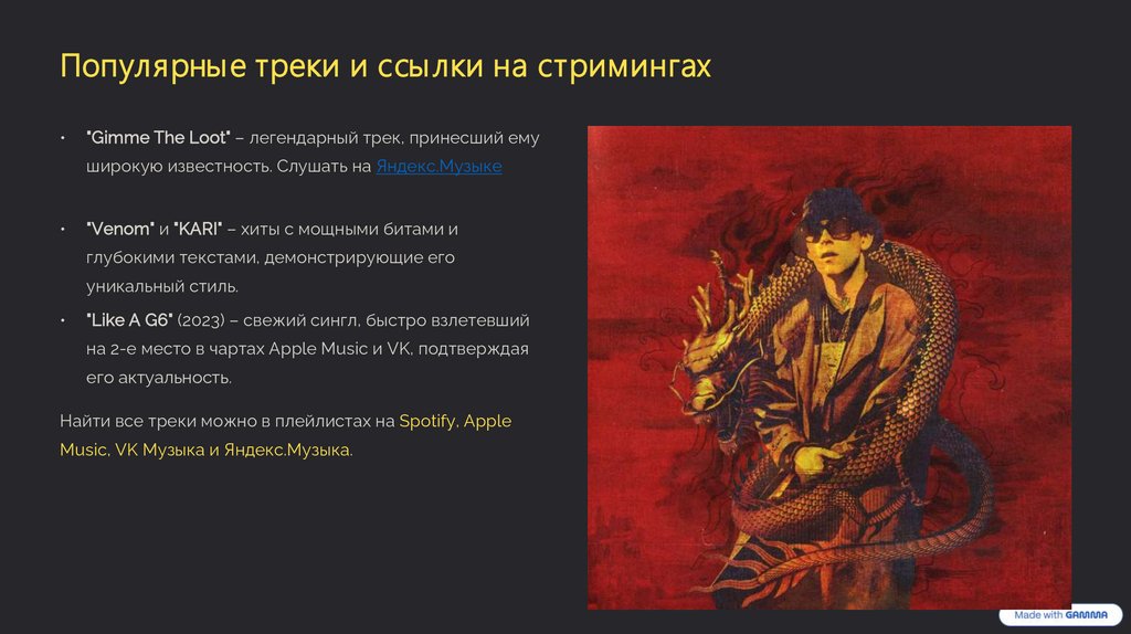 Популярные треки и ссылки на стримингах"Gimme The Loot" – легендарный трек, принесший ему