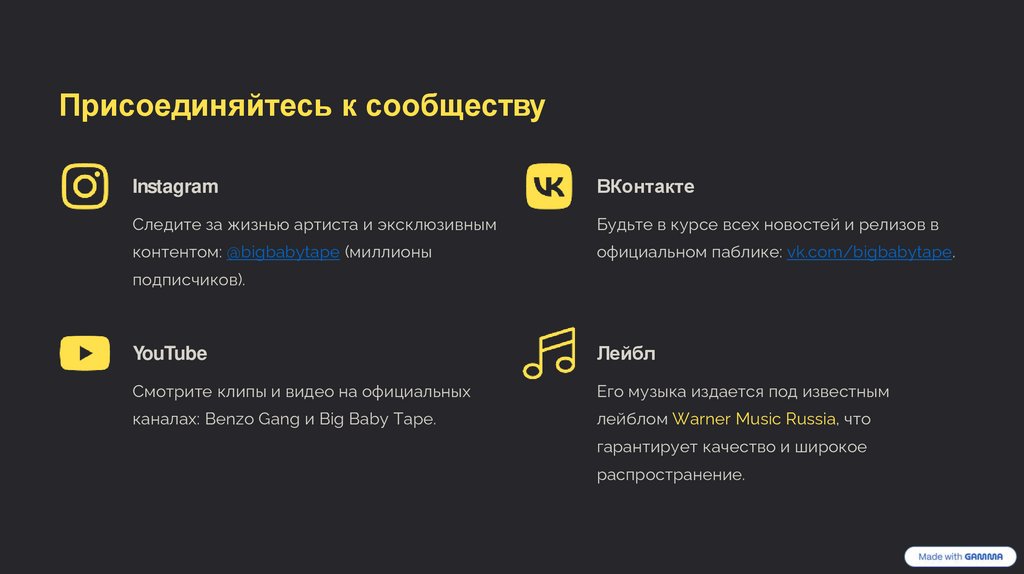 Не упустите новые релизы и продолжайте поддерживать артиста в социальных сетях, чтобы быть частью его