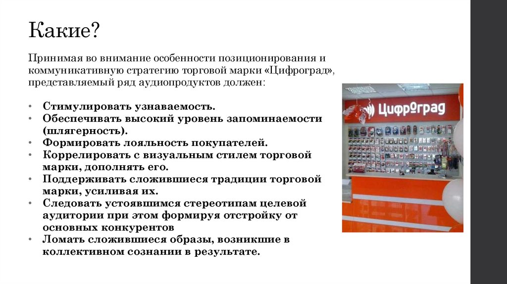 В пример можно привести фирменныйаудиостиль сети салонов связи «Цифроград».