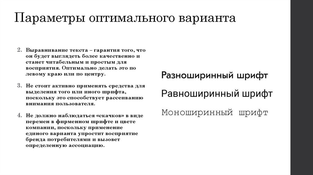 Параметры оптимального варианта2. Выравнивание текста – гарантия того, что