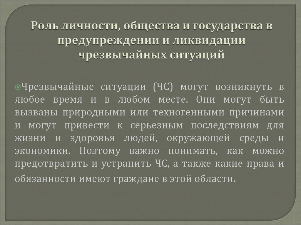 1. Роль личности, общества и государства в предупреждении и ликвидации чрезвычайных ситуаций
