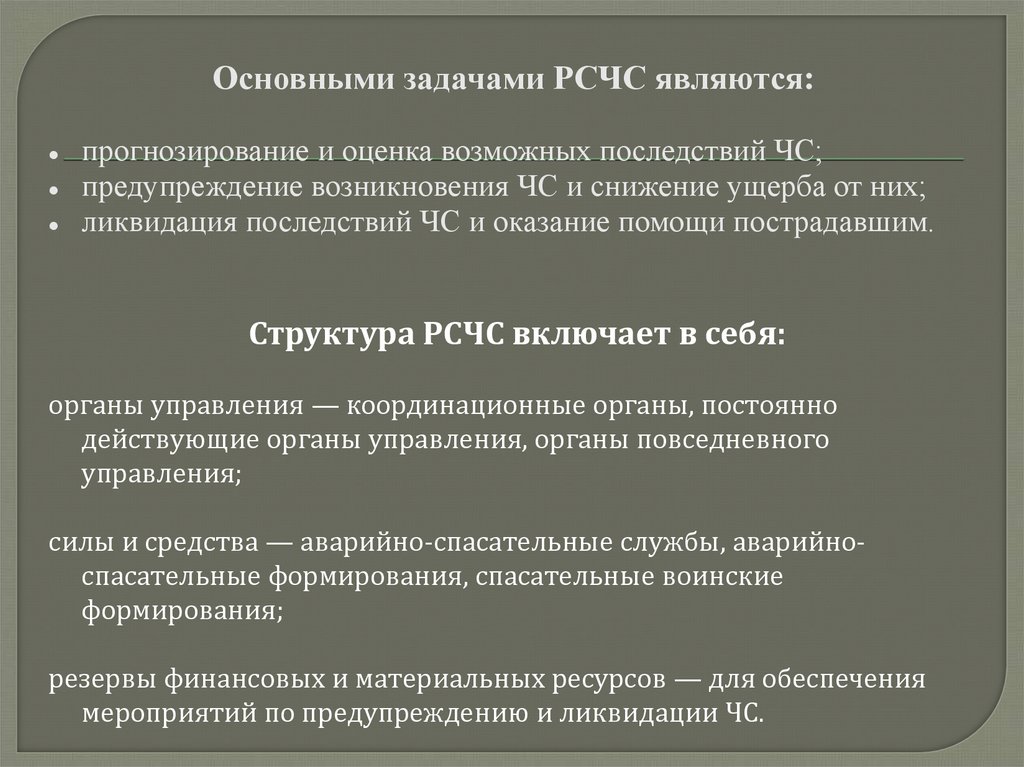 Основными задачами РСЧС являются:прогнозирование и оценка возможных последствий ЧС;