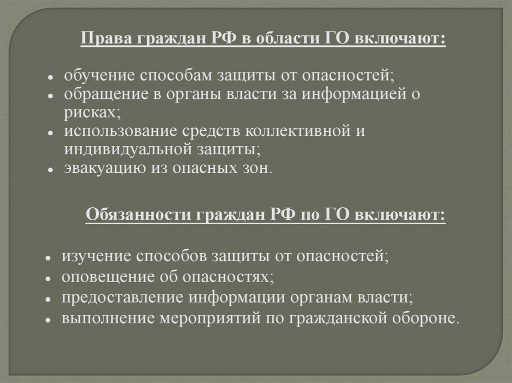 Права граждан РФ в области ГО включают:обучение способам защиты от опасностей;