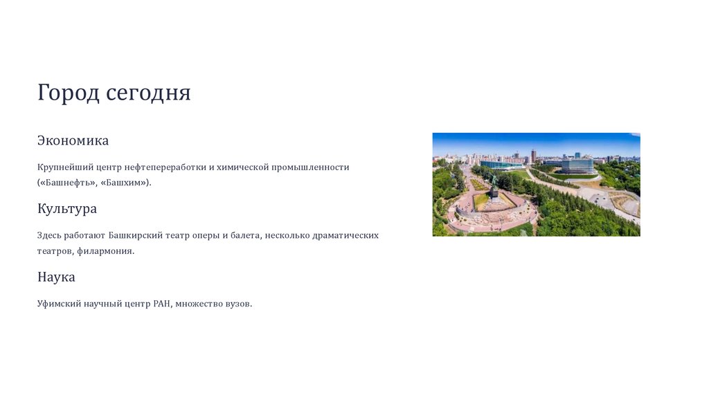 Здесь работают Башкирский театр оперы и балета, несколько драматических