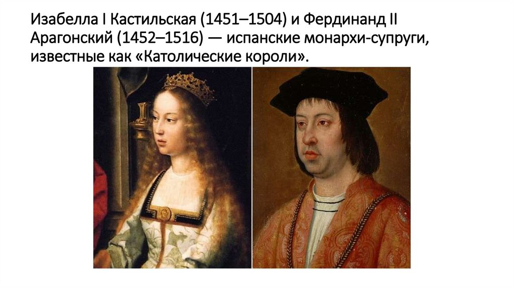 Изабелла I Кастильская (1451–1504) и Фердинанд IIАрагонский (1452–1516) — испанские монархи-супруги,