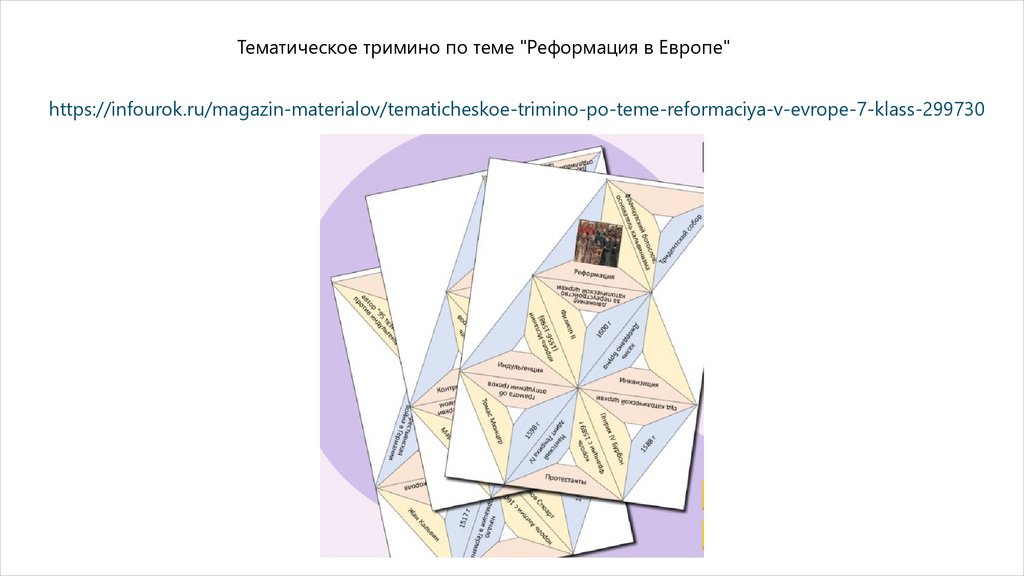 Тематическое тримино по теме "Реформация в Европе"https://infourok.ru/magazin-materialov/tematicheskoe-trimino-po-teme-reformaciya-v-evrope-7-klass-299730