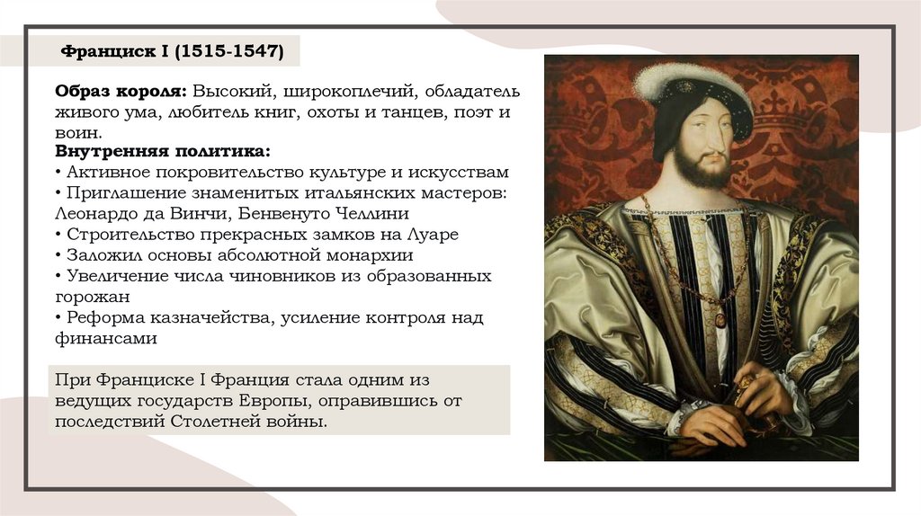 Франциск I (1515-1547)Образ короля: Высокий, широкоплечий, обладатель