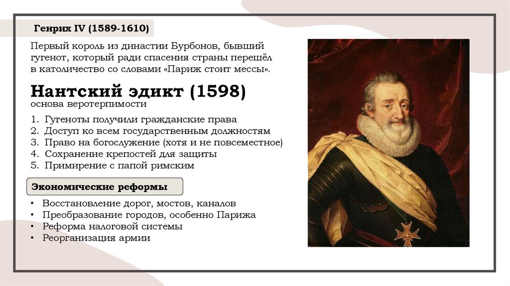 Генрих IV (1589-1610)Первый король из династии Бурбонов, бывший