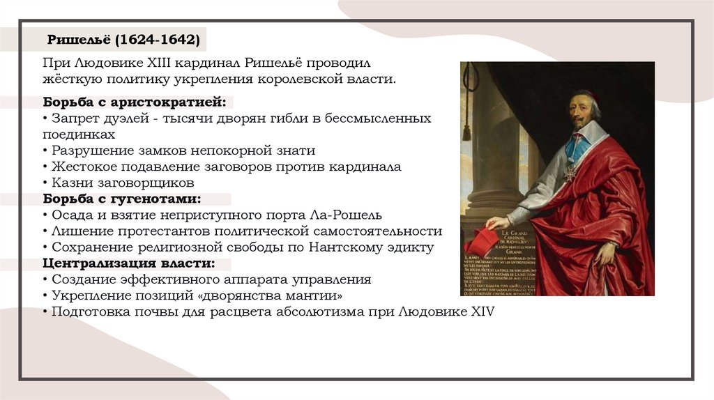 Ришельё (1624-1642)При Людовике XIII кардинал Ришельё проводил