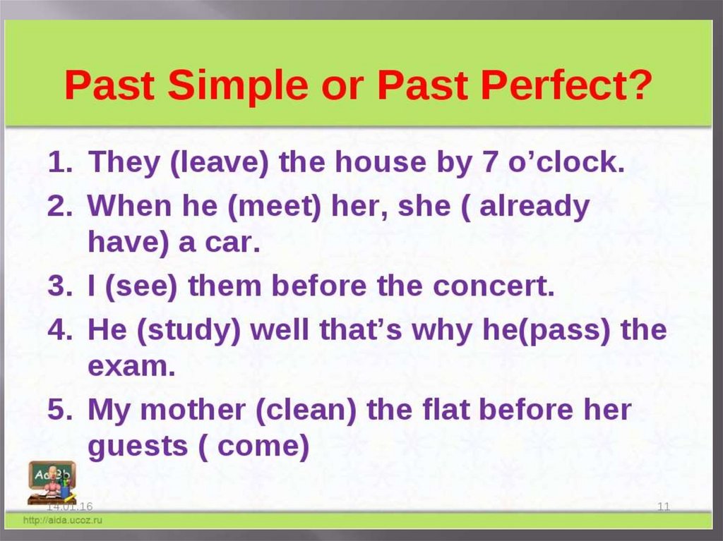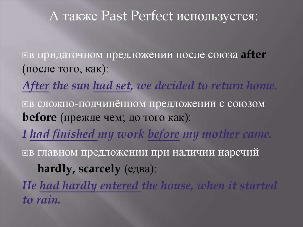 А также Past Perfect используется:в придаточном предложении после союза after