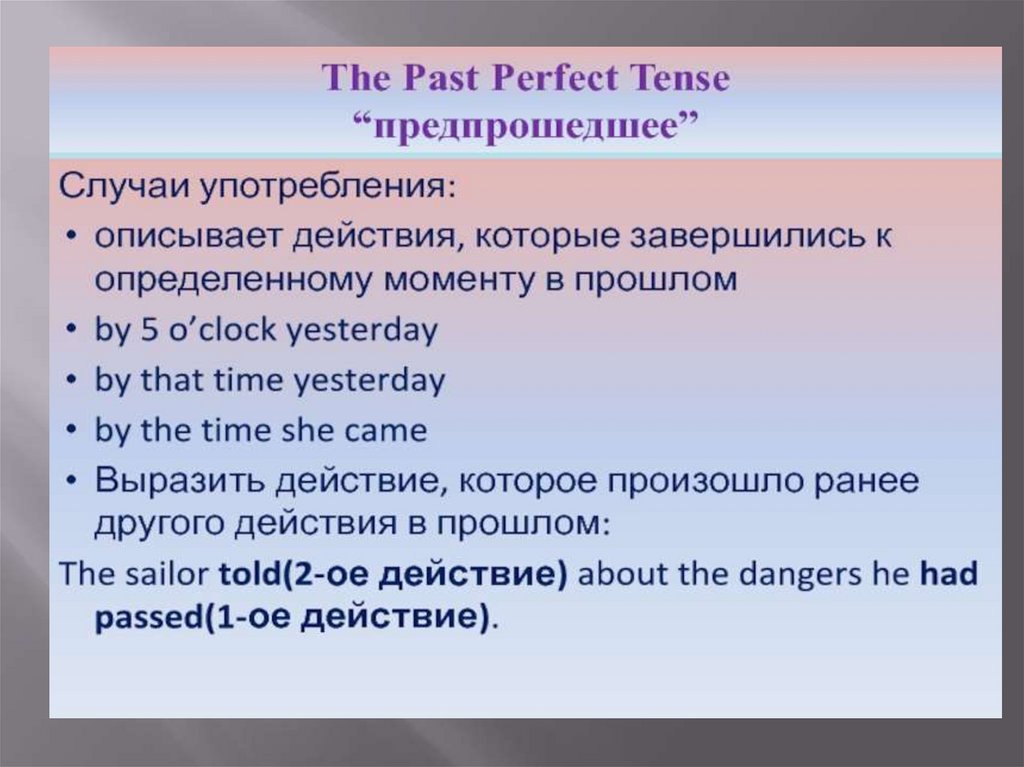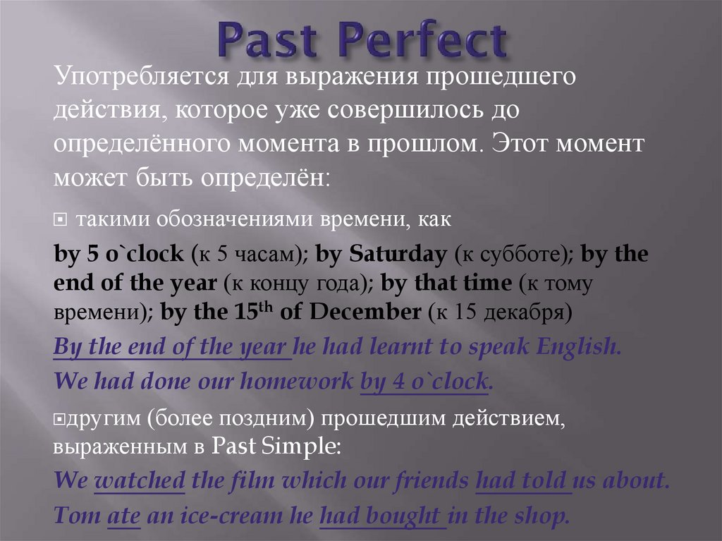 Употребляется для выражения прошедшегодействия, которое уже совершилось до