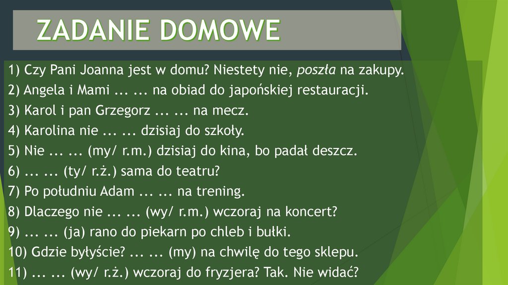1) Czy Pani Joanna jest w domu? Niestety nie, poszła na zakupy.2) Angela i Mami ... ... na obiad do japońskiej restauracji.