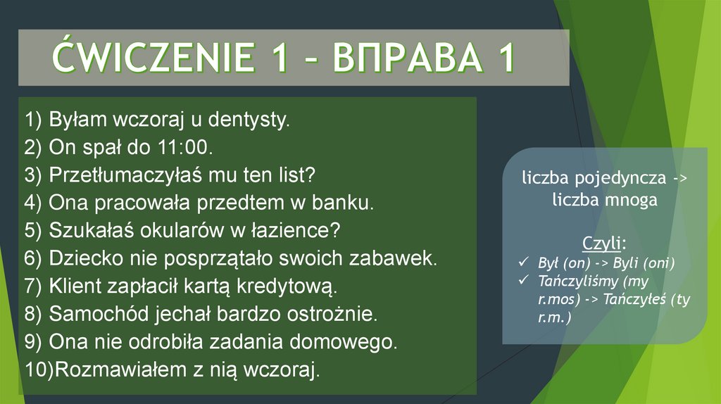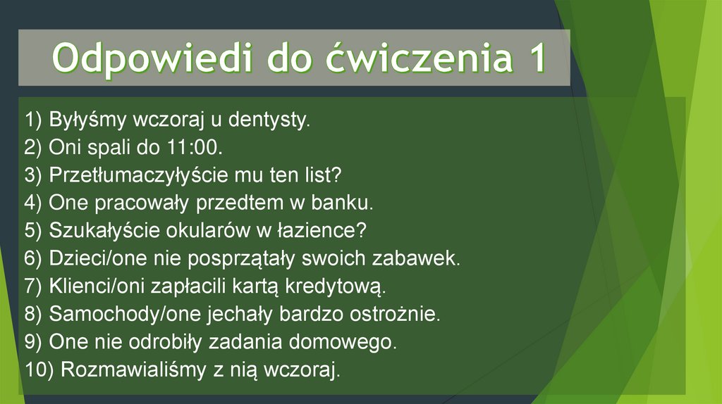 1) Byłyśmy wczoraj u dentysty.2) Oni spali do 11:00.