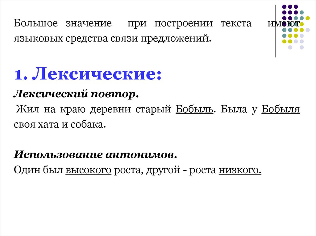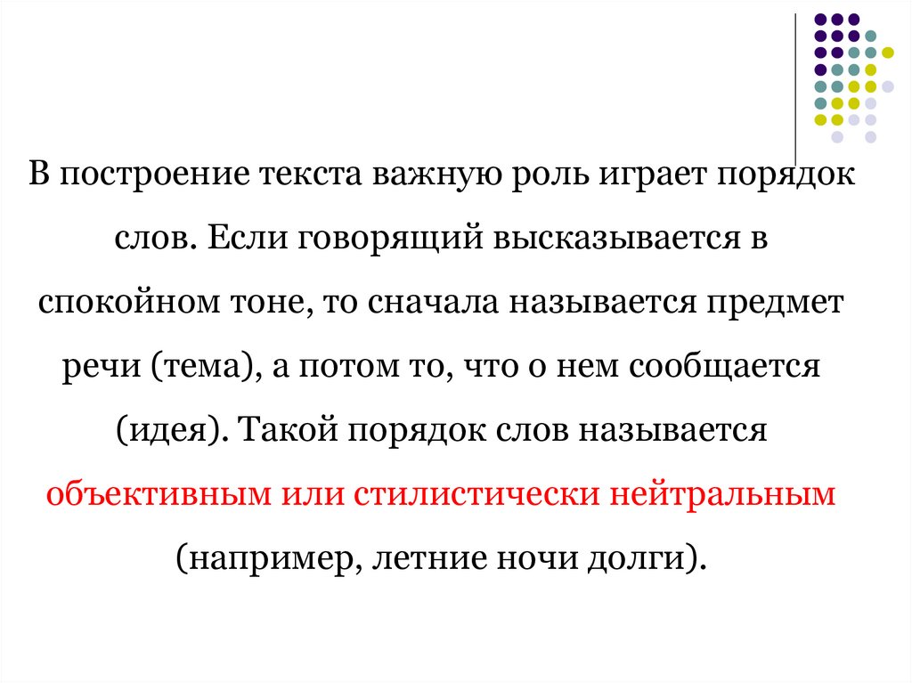 В построение текста важную роль играет порядокслов. Если говорящий высказывается в
