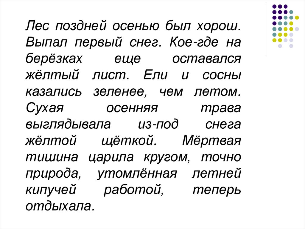 Лес поздней осенью был хорош.Выпал первый снег. Кое-где на
