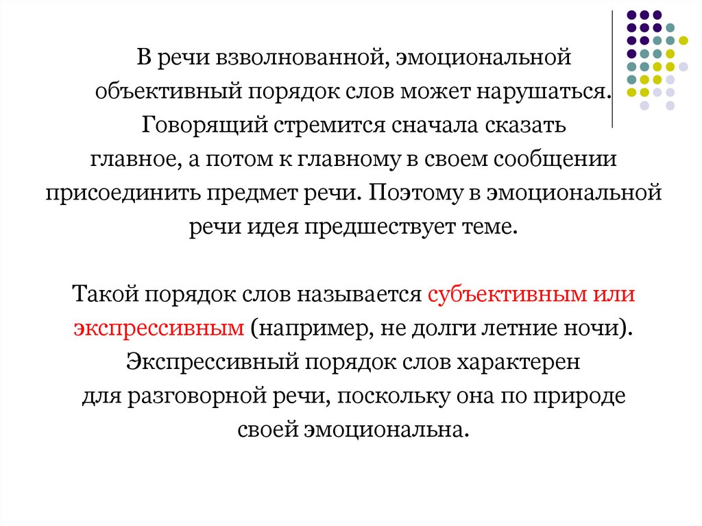 В речи взволнованной, эмоциональнойобъективный порядок слов может нарушаться.