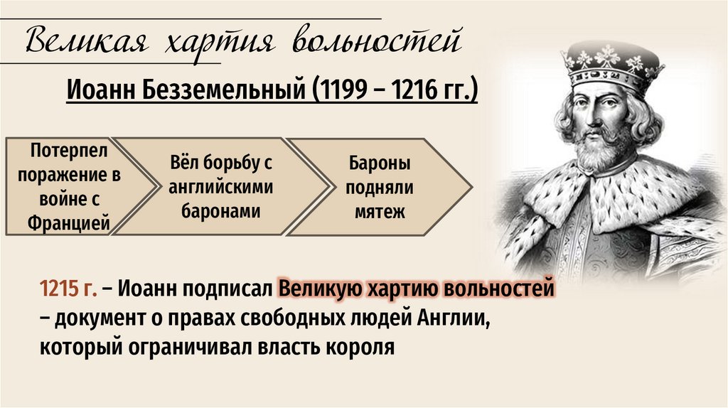Великая хартия вольностейИоанн Безземельный (1199 – 1216 гг.)