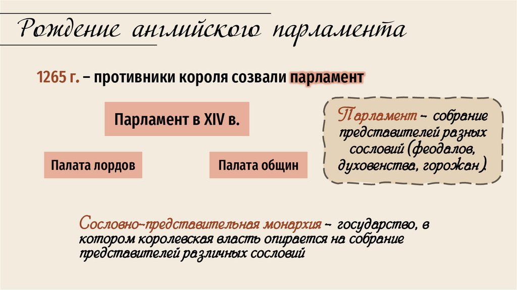 Рождение английского парламента1265 г. – противники короля созвали парламент