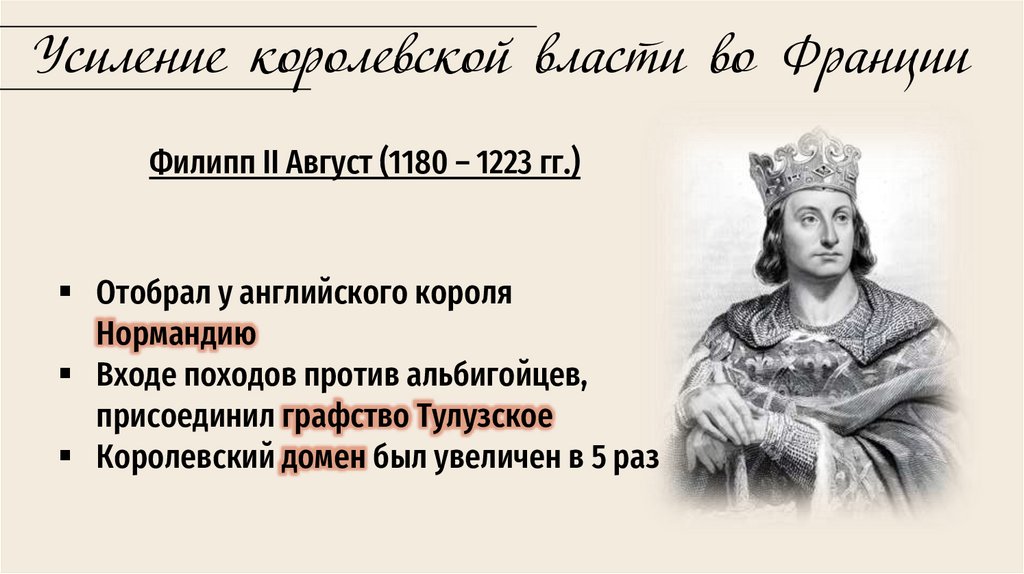 Усиление королевской власти во ФранцииФилипп II Август (1180 – 1223 гг.)