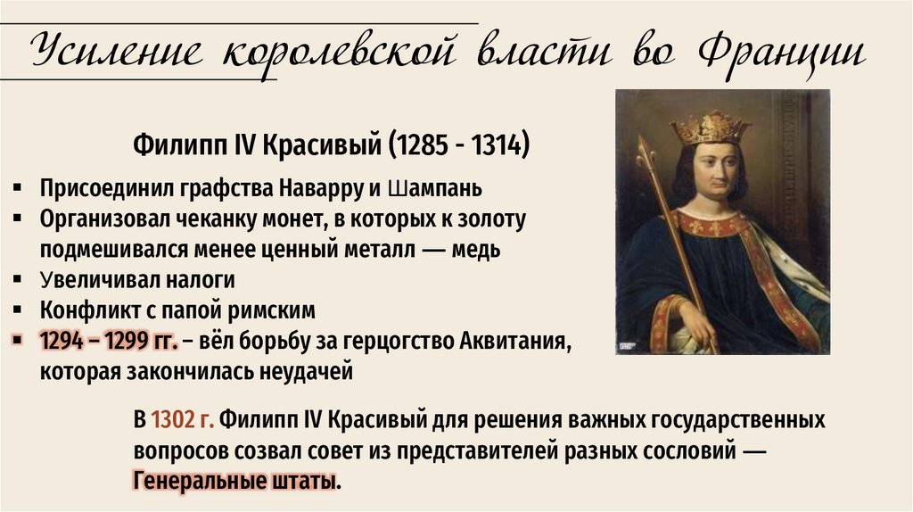 Усиление королевской власти во ФранцииФилипп IV Красивый (1285 - 1314)