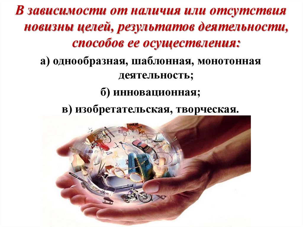 В зависимости от наличия или отсутствияновизны целей, результатов деятельности,