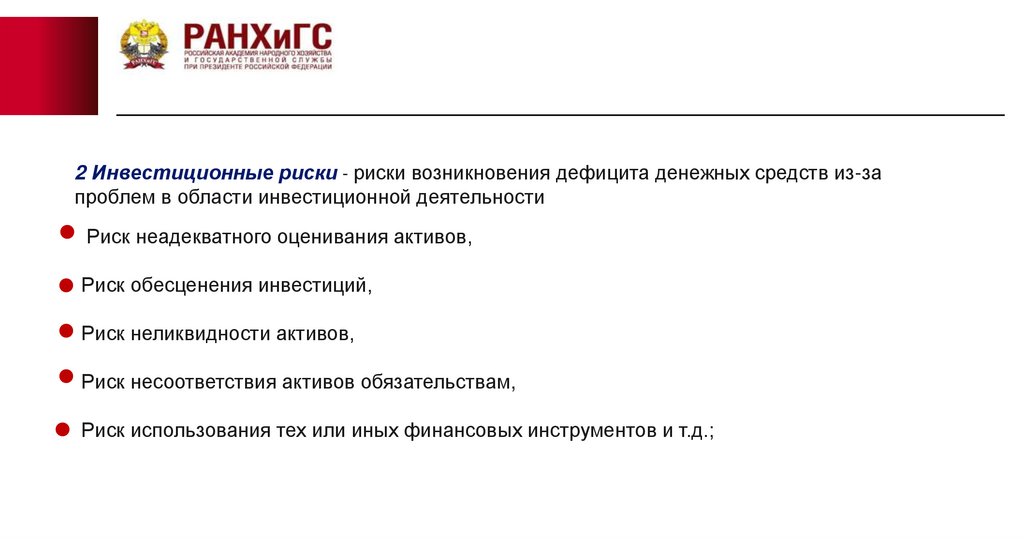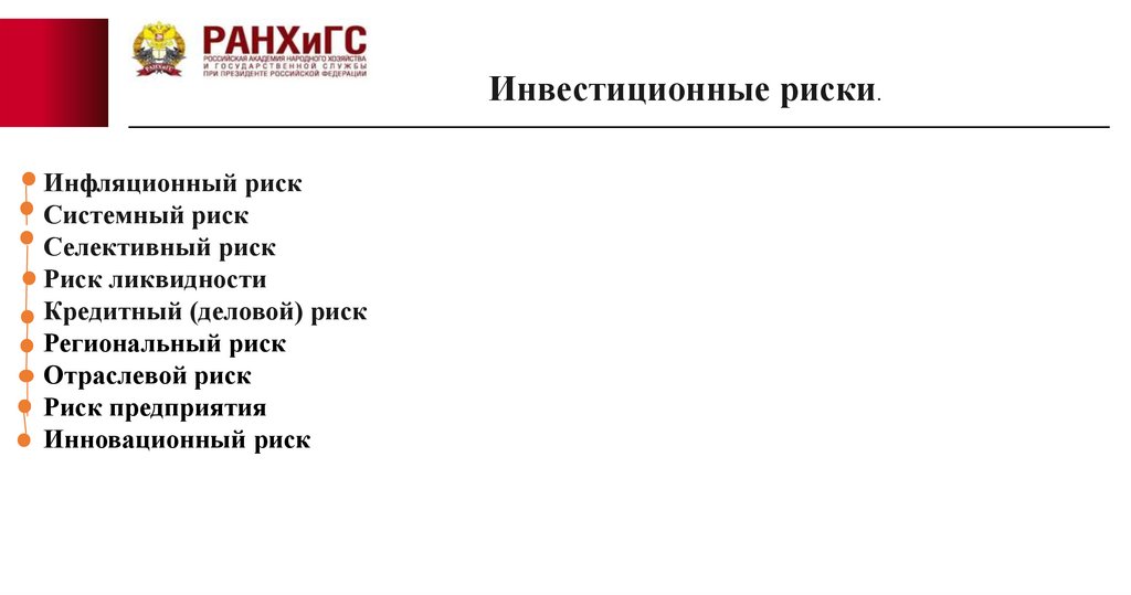 • селективные риски (риски неправильного формирования видов вложения капиталов,