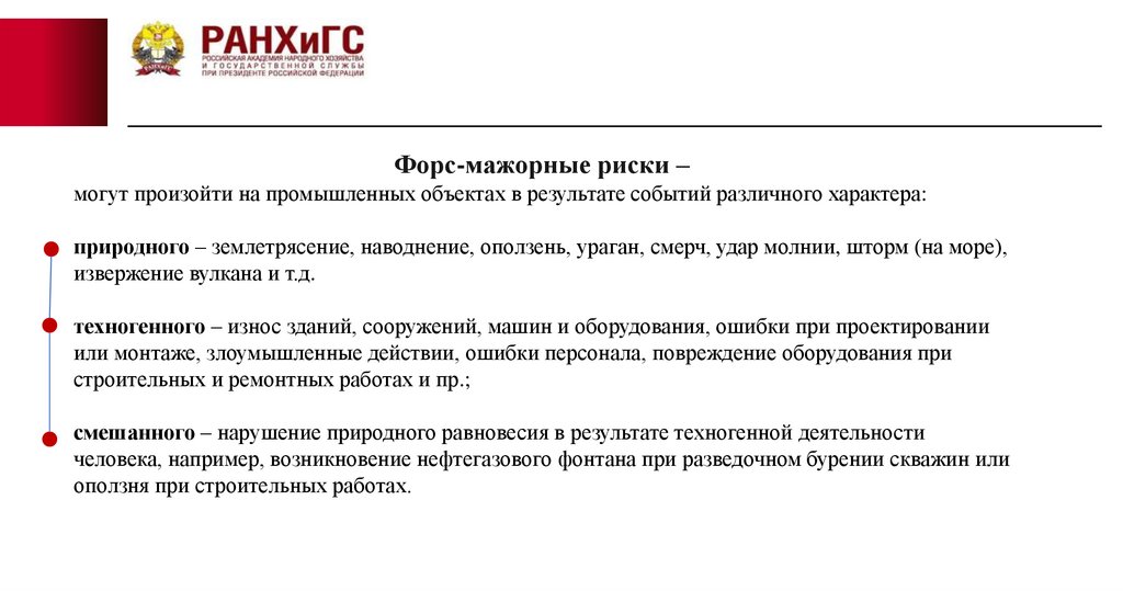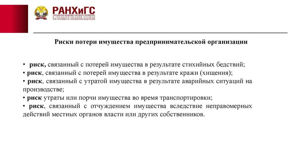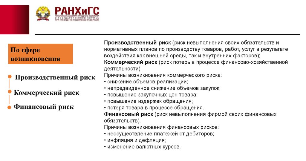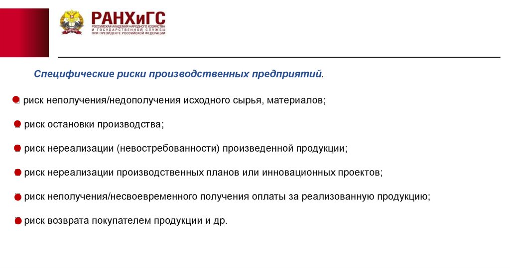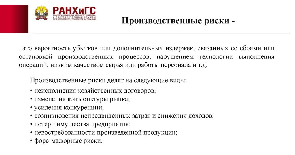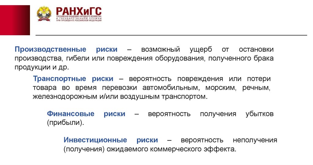 Производственные риски – возможный ущерб от остановкипроизводства, гибели или повреждения оборудования, полученного брака