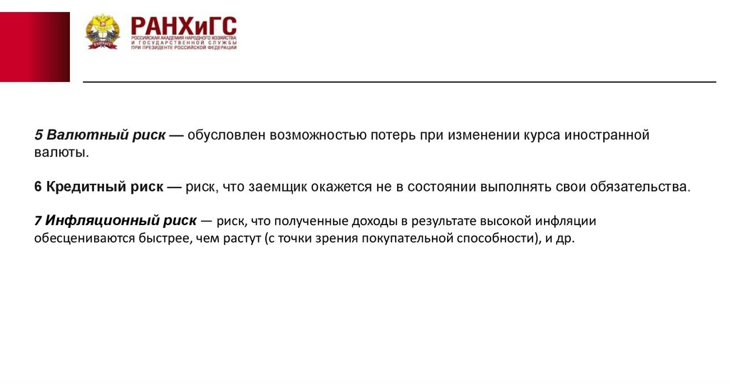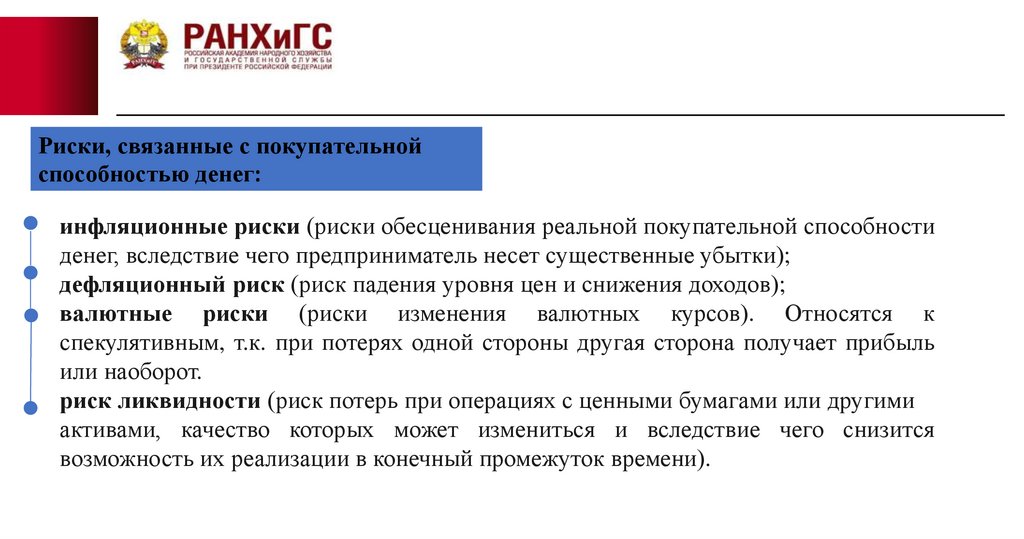 дефляционный риск (риск падения уровня цен и снижения доходов);