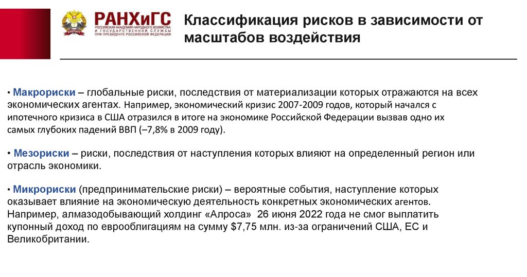 • Макрориски – глобальные риски, последствия от материализации которых отражаются на всех