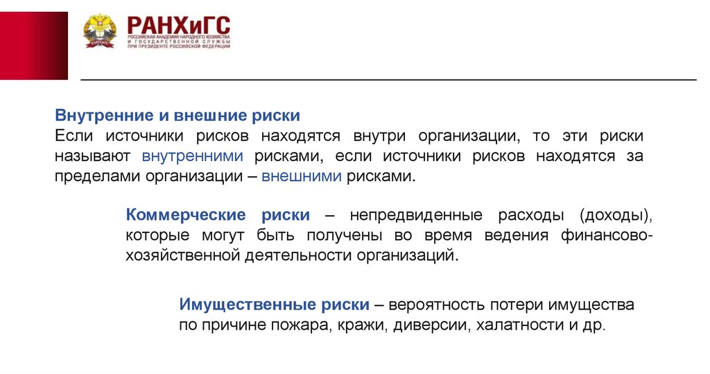 Внутренние и внешние рискиЕсли источники рисков находятся внутри организации, то эти риски