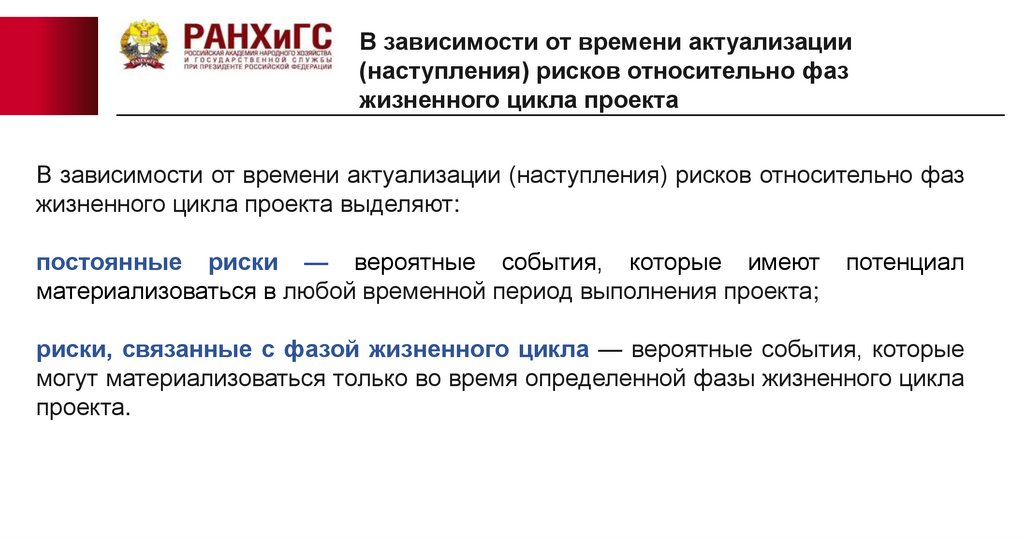 В зависимости от времени актуализации(наступления) рисков относительно фаз