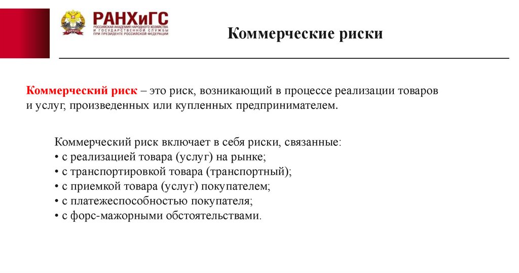 Коммерческие рискиКоммерческий риск – это риск, возникающий в процессе реализации товаров