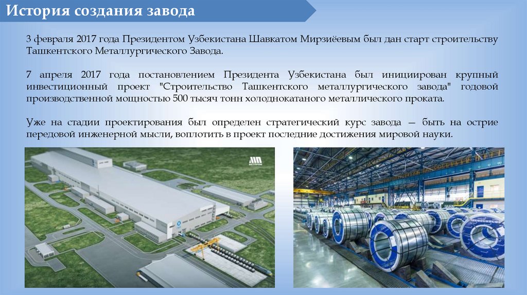 История создания завода3 февраля 2017 года Президентом Узбекистана Шавкатом Мирзиёевым был дан старт строительству