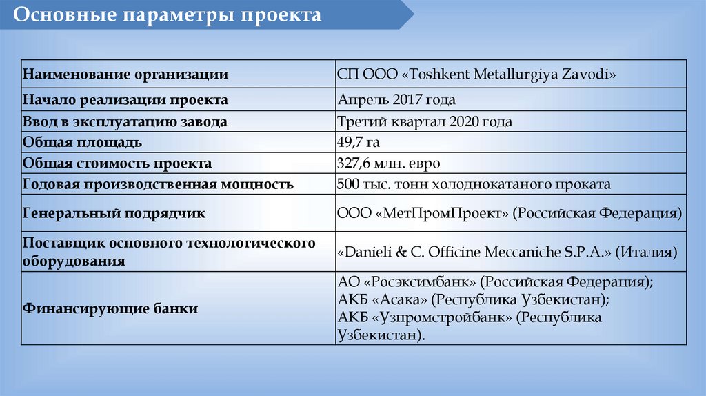 инвестиционный проект "Строительство Ташкентского металлургического завода" годовой