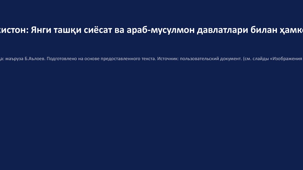 кистон: Янги ташқи сиёсат ва араб-мусулмон давлатлари билан ҳамкода: маъруза Б.Аълоев. Подготовлено на основе предоставленного текста. Источник: пользовательский документ. (см. слайды «Изображения и