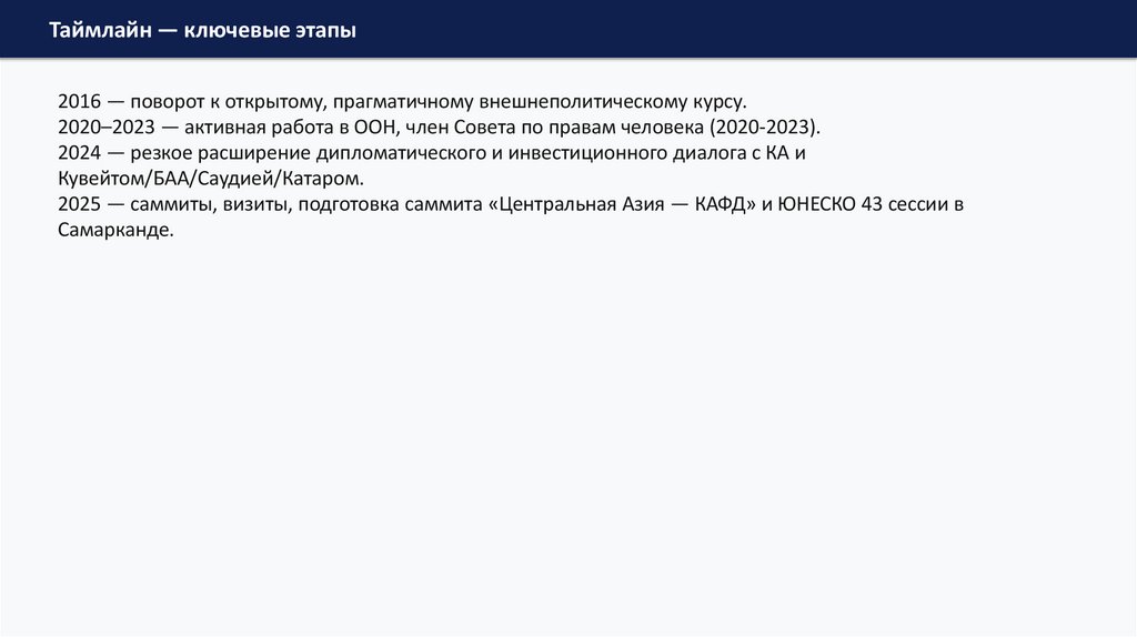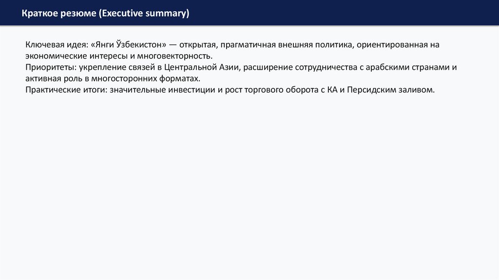 Краткое резюме (Executive summary)Ключевая идея: «Янги Ўзбекистон» — открытая, прагматичная внешняя политика, ориентированная на