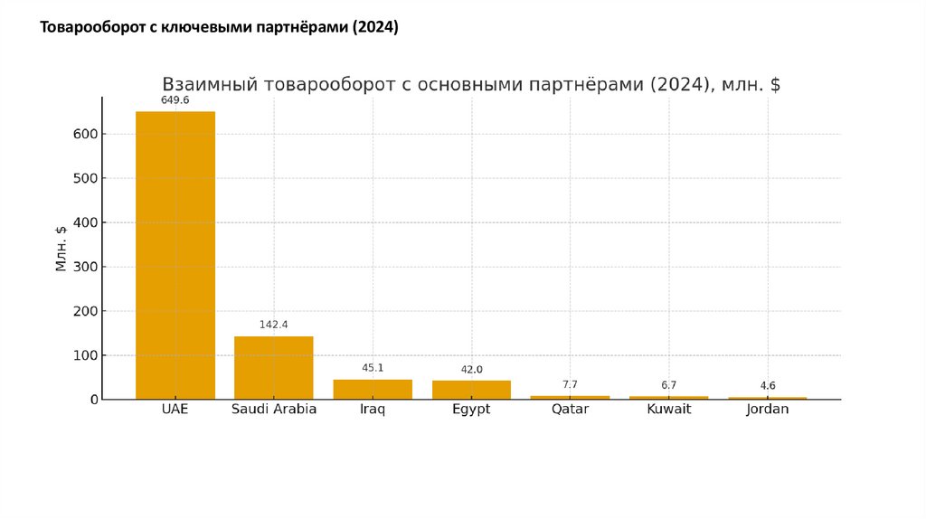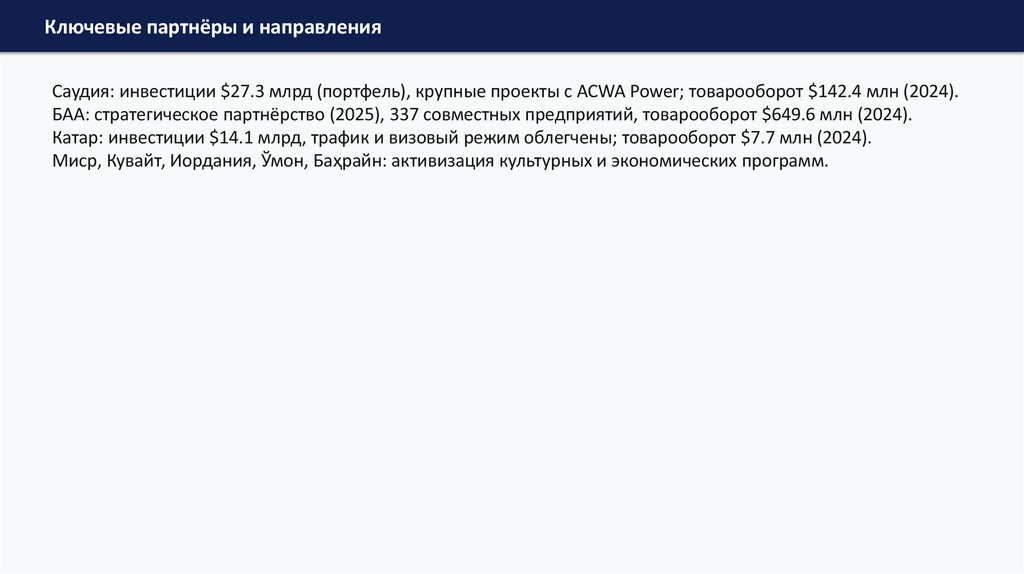 Ключевые партнёры и направленияСаудия: инвестиции $27.3 млрд (портфель), крупные проекты с ACWA Power; товарооборот $142.4 млн (2024).