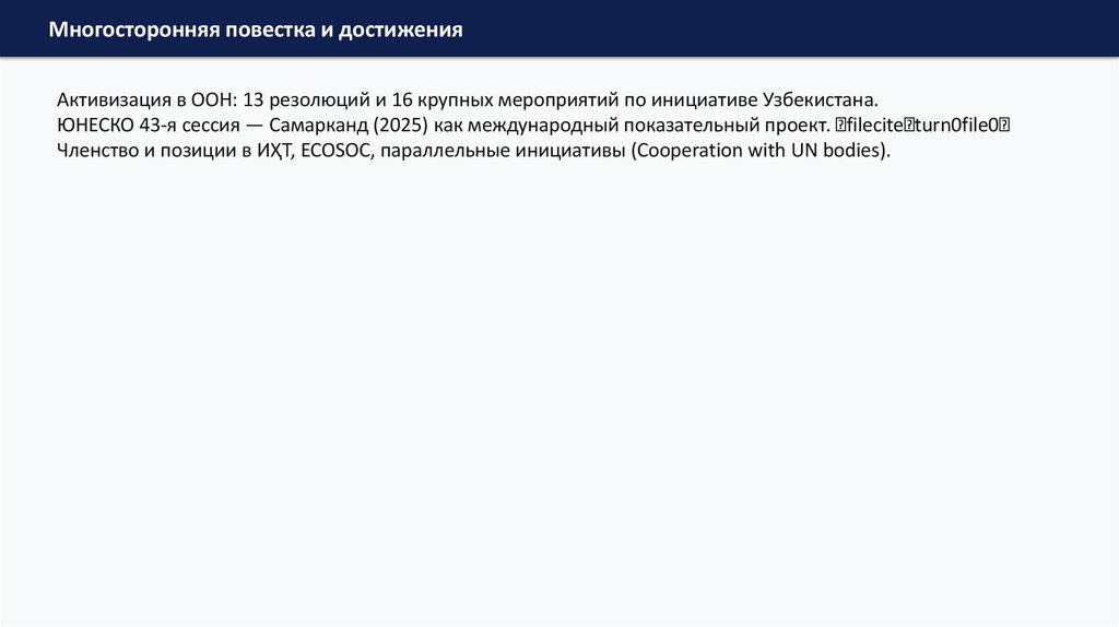 Многосторонняя повестка и достиженияАктивизация в ООН: 13 резолюций и 16 крупных мероприятий по инициативе Узбекистана.