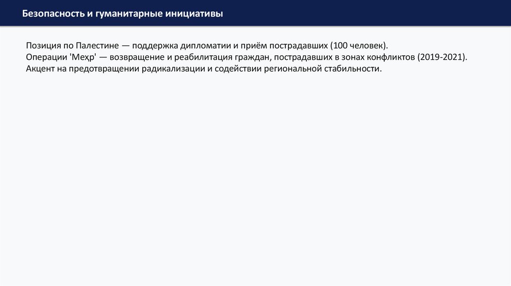 Безопасность и гуманитарные инициативыПозиция по Палестине — поддержка дипломатии и приём пострадавших (100 человек).
