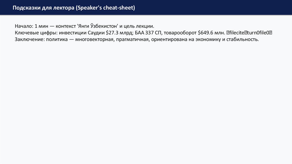Подсказки для лектора (Speaker's cheat-sheet)Начало: 1 мин — контекст 'Янги Ўзбекистон' и цель лекции.