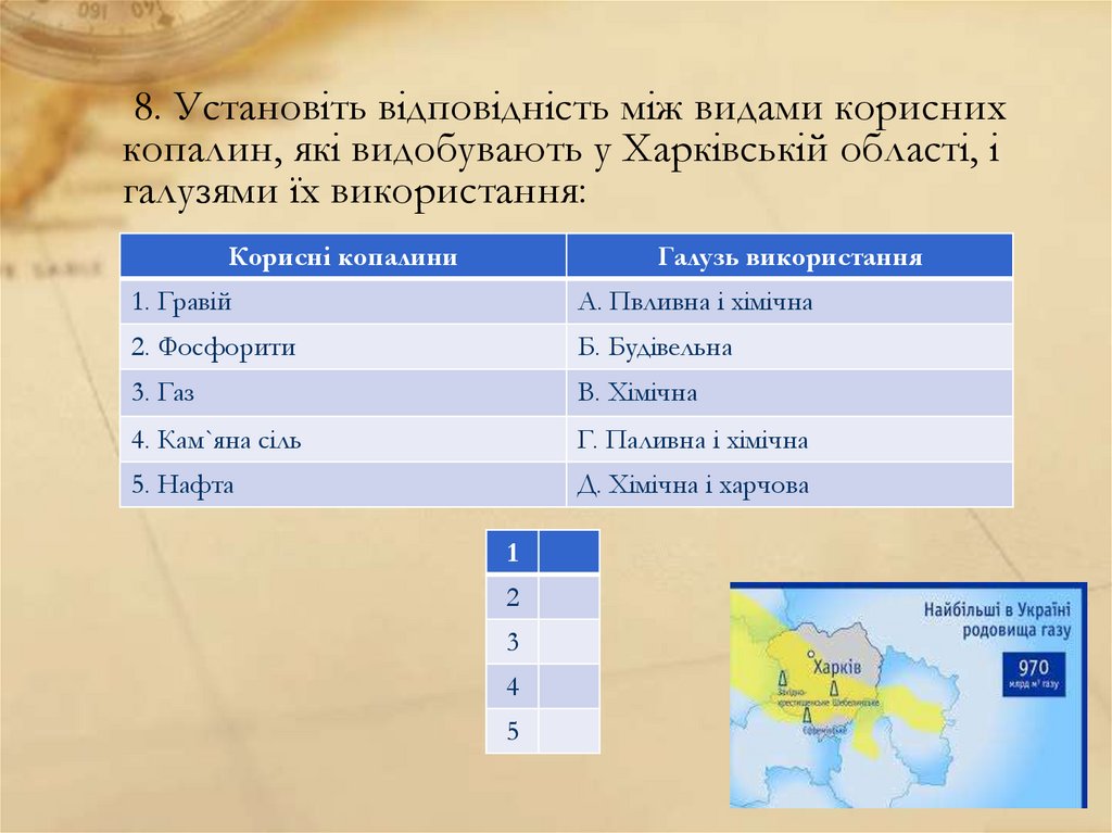 1. 8. Установіть відповідність між видами корисних копалин, які видобувають у Харківській області, і галузями їх використання: