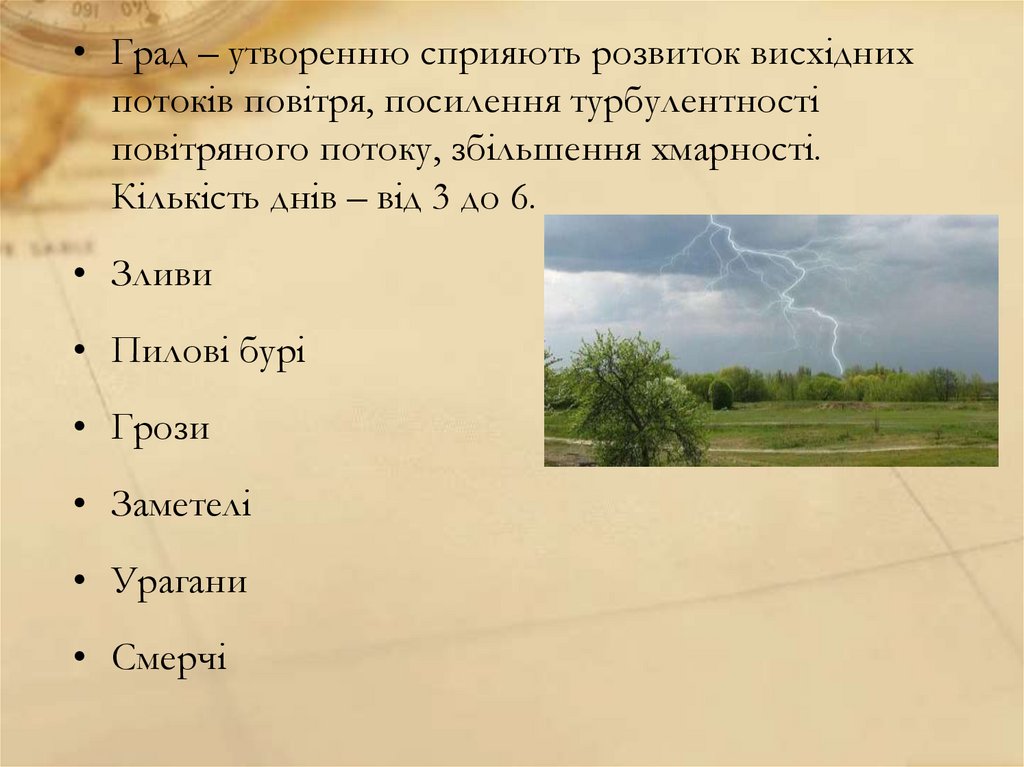 • Град – утворенню сприяють розвиток висхіднихпотоків повітря, посилення турбулентності