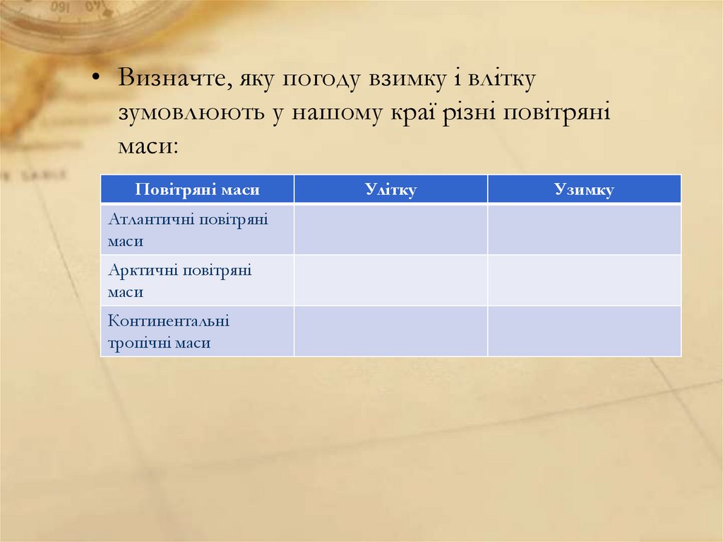 • Визначте, яку погоду взимку і вліткузумовлюють у нашому краї різні повітряні