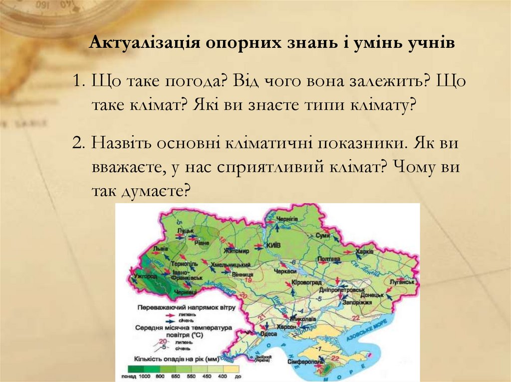 Актуалізація опорних знань і умінь учнів1. Що таке погода? Від чого вона залежить? Що
