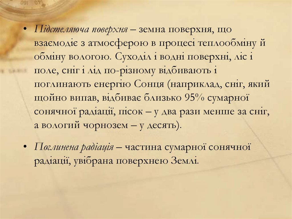 • Підстеляюча поверхня – земна поверхня, щовзаємодіє з атмосферою в процесі теплообміну й