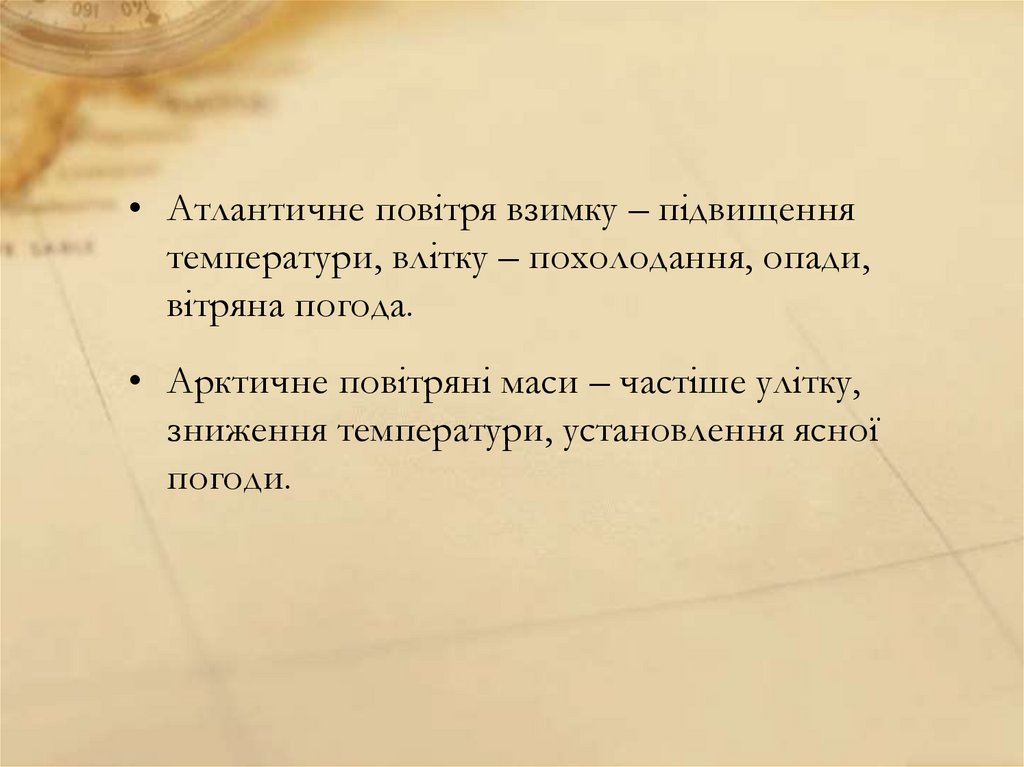 • Атлантичне повітря взимку – підвищеннятемператури, влітку – похолодання, опади,
