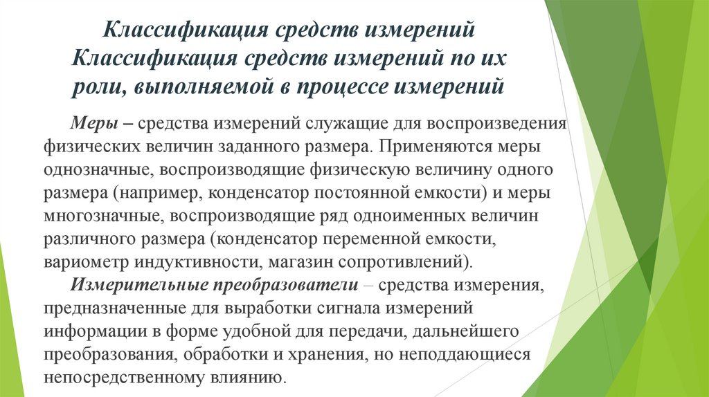 1. Классификация средств измерений Классификация средств измерений по их роли, выполняемой в процессе измерений