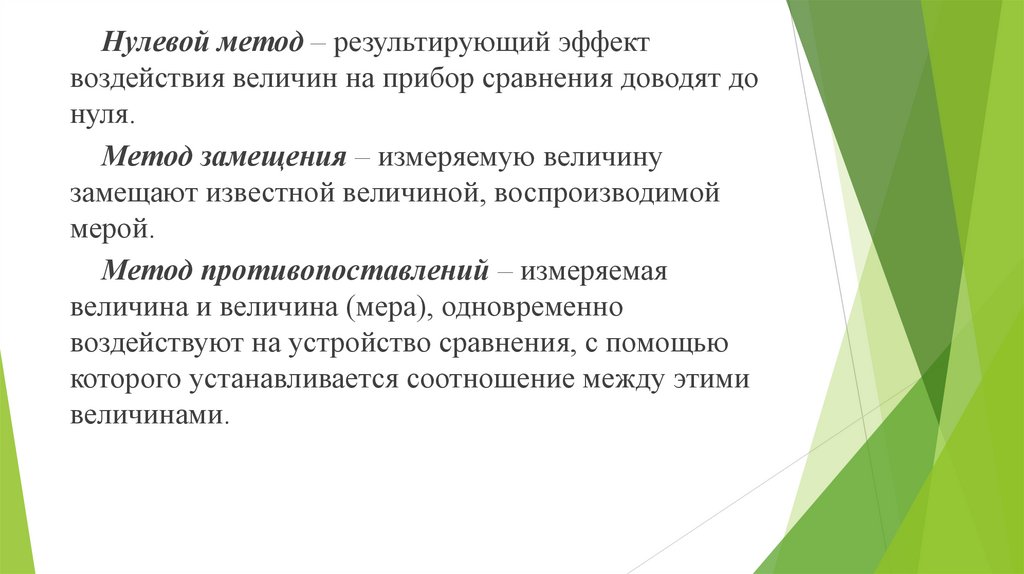 Нулевой метод – результирующий эффектвоздействия величин на прибор сравнения доводят до