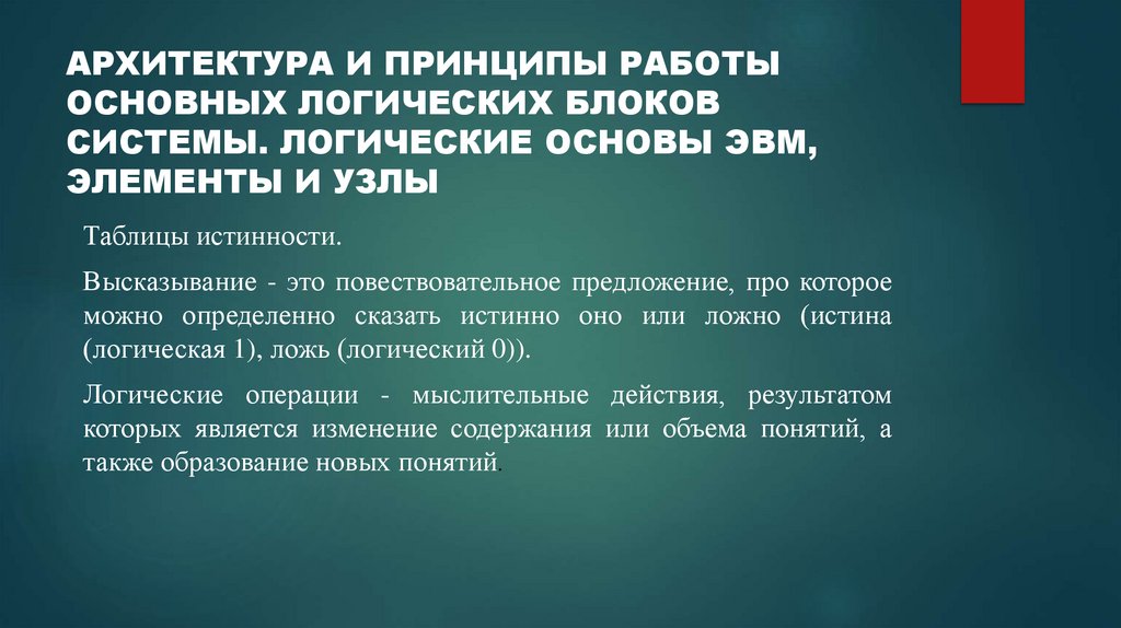 1. АРХИТЕКТУРА И ПРИНЦИПЫ РАБОТЫ ОСНОВНЫХ ЛОГИЧЕСКИХ БЛОКОВ СИСТЕМЫ. ЛОГИЧЕСКИЕ ОСНОВЫ ЭВМ, ЭЛЕМЕНТЫ И УЗЛЫ